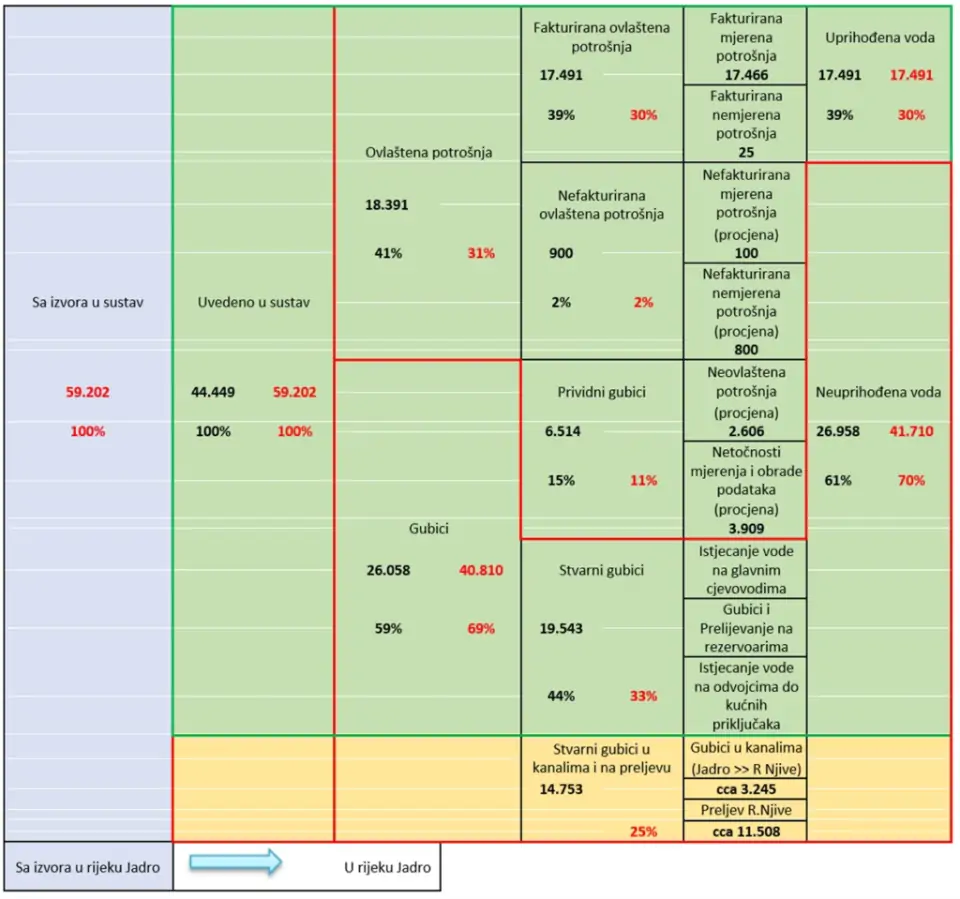 - Promatrajući aspekt 1 (crvene brojke): Uprihođena voda iznosi 30%, a neuprihođena 70%. To uključuje stvarne gubitke od oko 14,753 milijuna m3/godišnje na dovodnim kanalima i preljevu CS Ravne Njive.